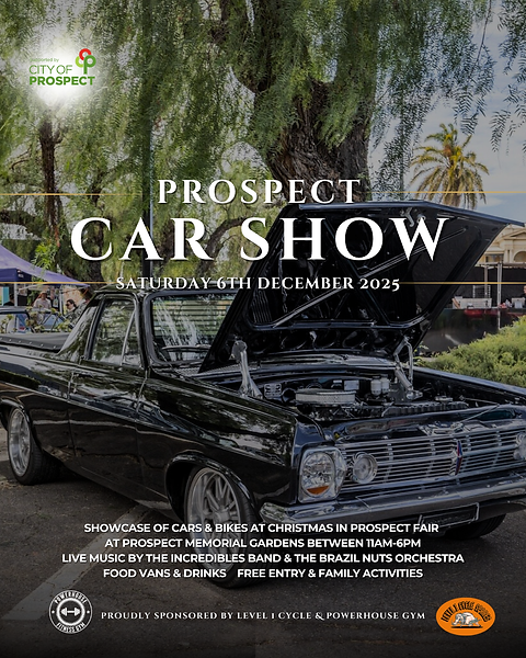 Prospect's Car Show n Shine sponsored by locals Level 1 Cycles - Judged on the day with trophies awarded to Best car & bike, best original car, and Peoples Choice awards. Vote for your favourite car and bike!